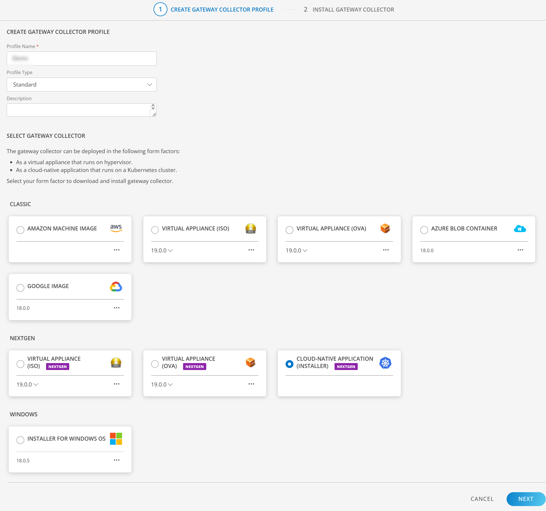 - Gateway Collector: Select the CLOUD-NATIVE APPLICATION (INSTALLER) NEXTGEN tile.