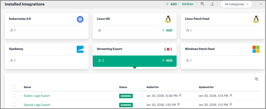 Note: Search for the integration either by entering the name of the integration in the search bar or by selecting the category of the integration from the All Categories dropdown list. - Click ADD in the Elastic Stream Export application.