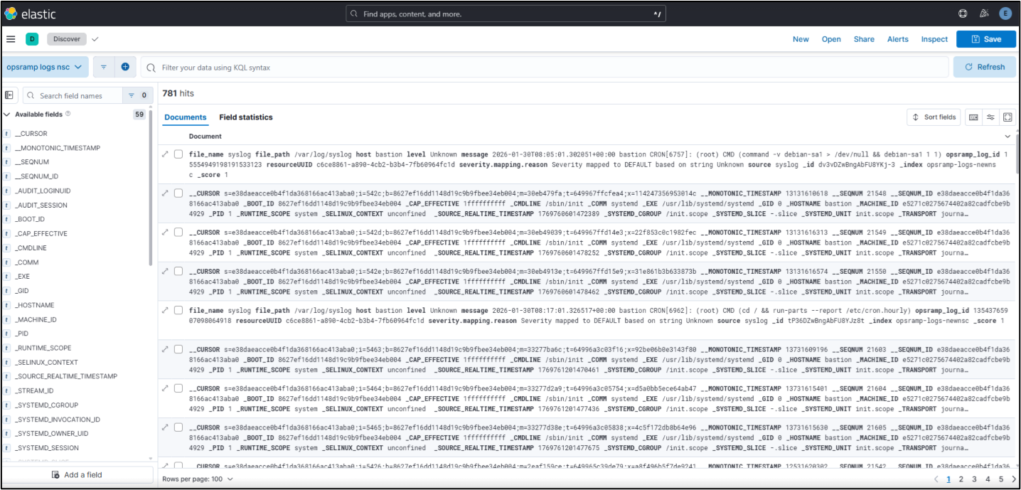 - Trigger log generation from monitored resources. The following screenshot refers to logs posted to Elasticsearch from HPE and viewed using Kibana.