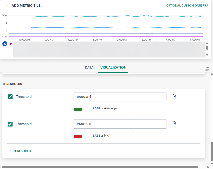 Visualizations are based on the number of queries selected. Different visualization types support different numbers of queries.Example 1: Threshold values (low and high) that will be displayed as a line on the graph.