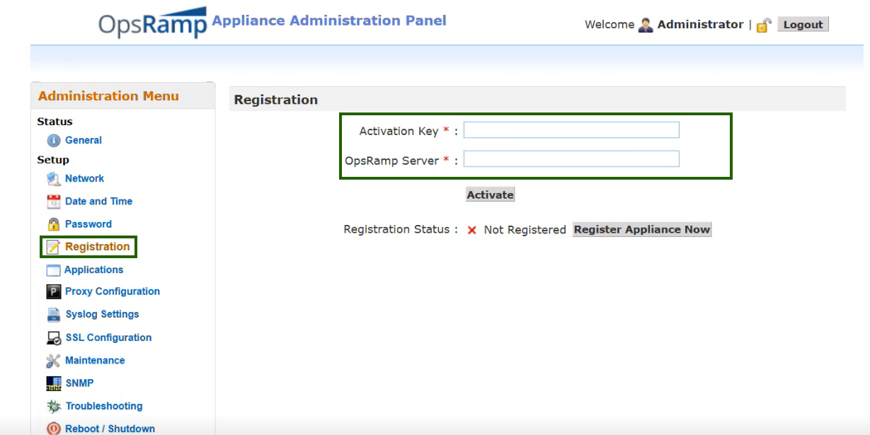 - Enter the Activation Key and OpsRamp Server details in the registration page. Click Activate.
