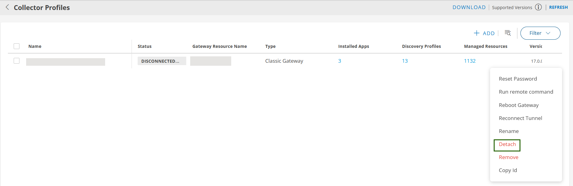 - Select the collector profile associated with the Gateway you want to replace and click Detach Gateway.