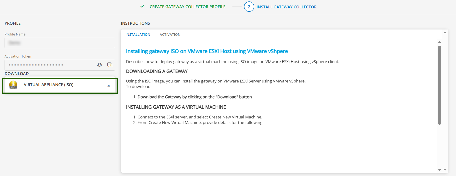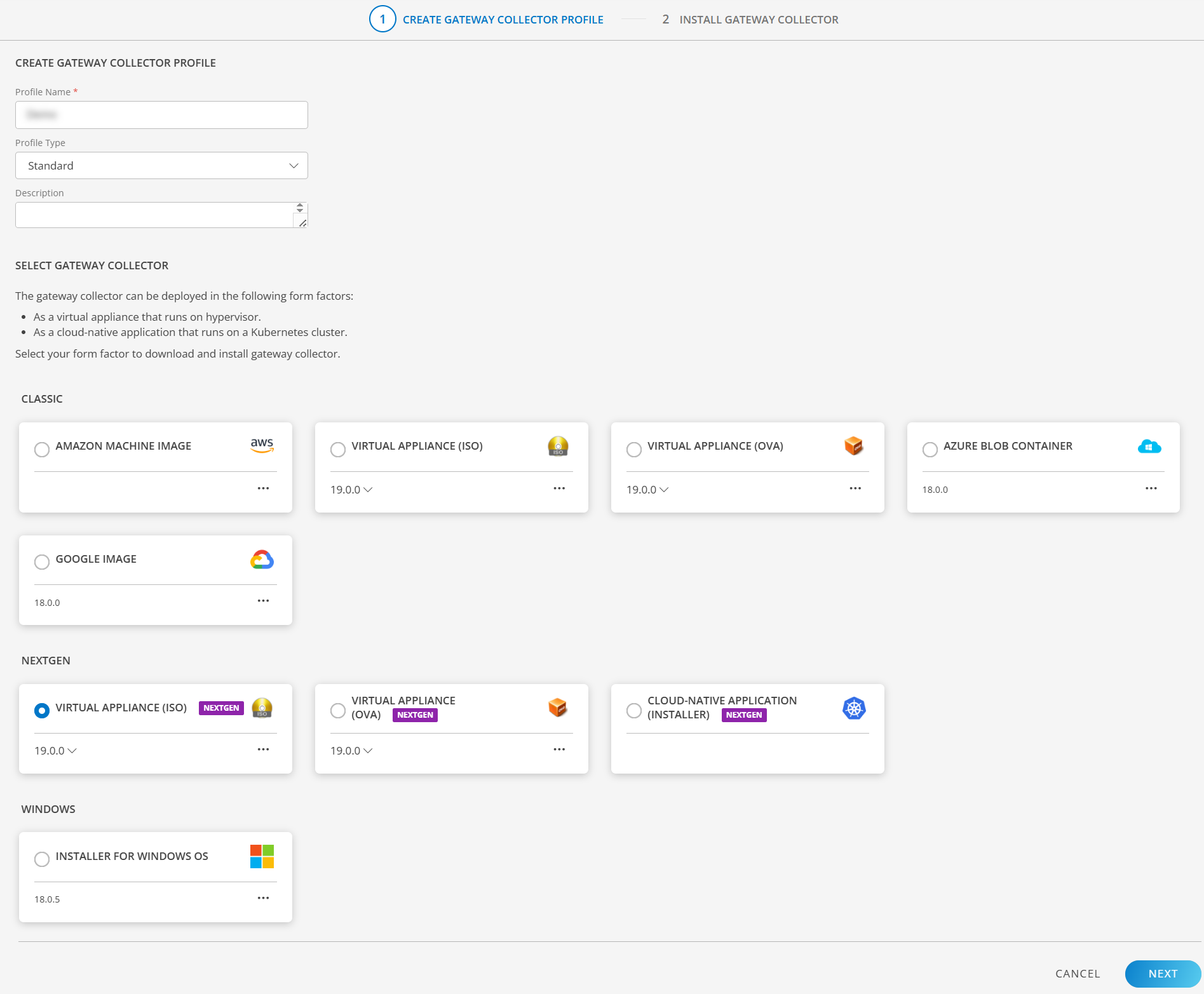 - Gateway Collector (NextGen): Select the VIRTUAL APPLIANCE (ISO) tile. You can also choose the desired Gateway version from the available options from the dropdown.