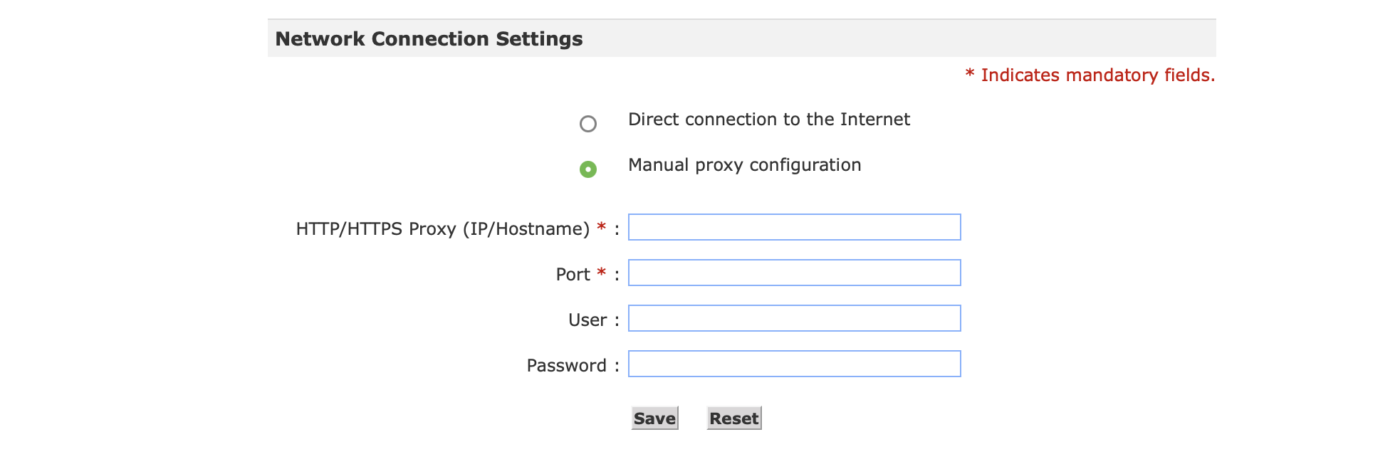 To use a proxy, navigate to Network > Network Connection Settings and then select the Manual proxy configuration option. By default, the Direct connection to the Internet option is selected.