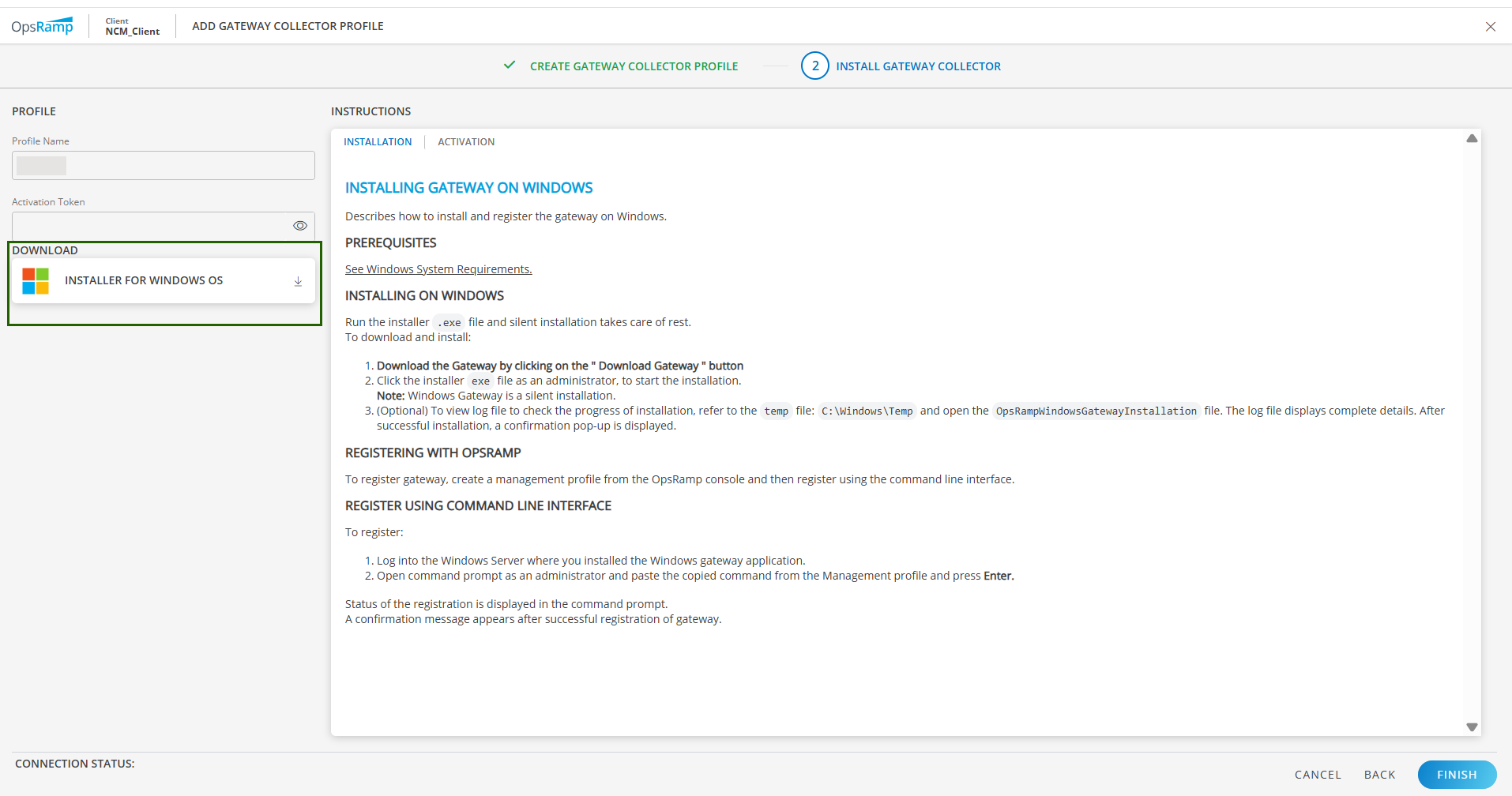 GatewayConfig.exe --api_server ncm.uat-api.opsramp.net --activation_key cf4f58fa-efbc-4f1c-a168-123976ee1cf5- Click Finish. The status of the Gateway changes to CONNECTED.