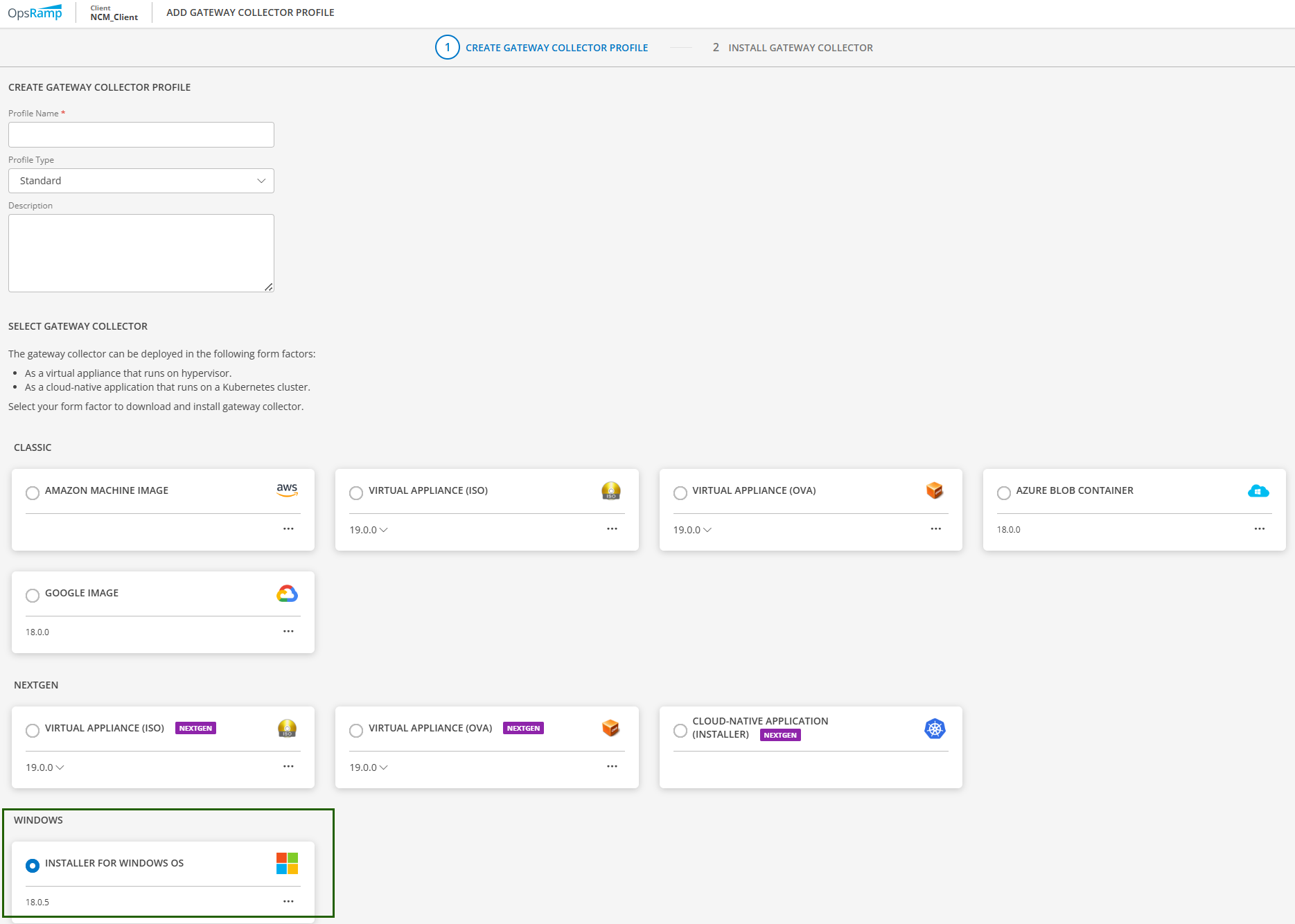 - Gateway Collector: Select the INSTALLER FOR WINDOWS OS tile.