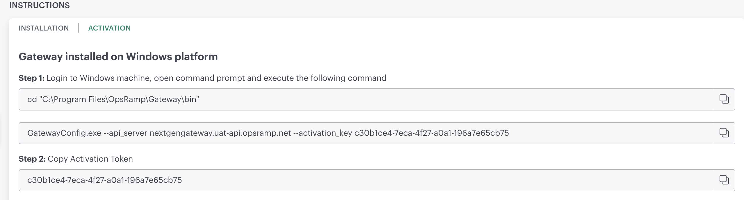 - Paste the command copied from the Step 1 under the option Gateway Installed on Windows platform and press Enter.