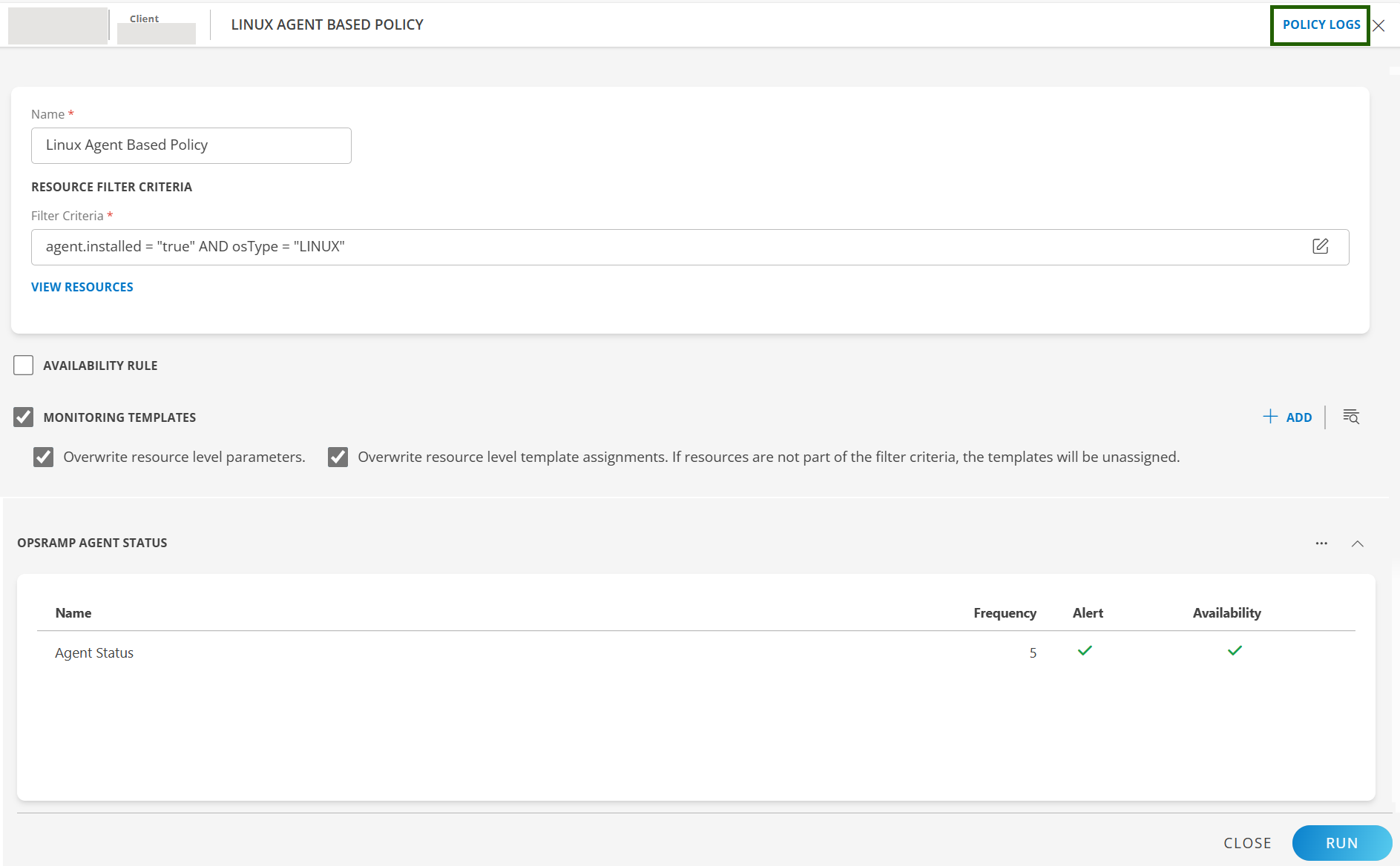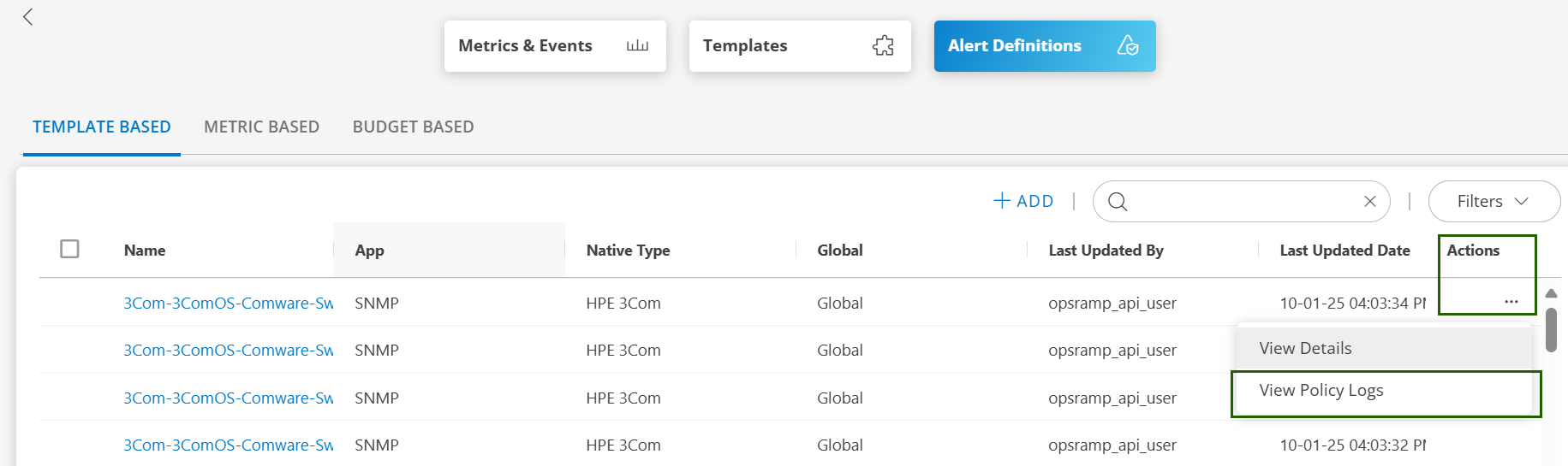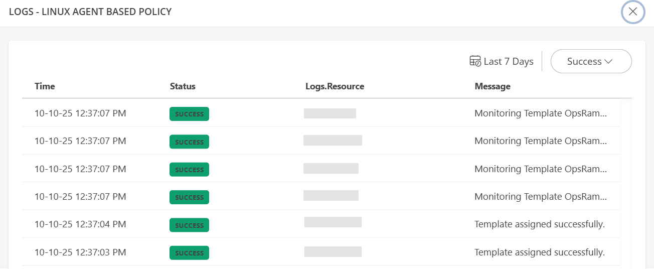Policy Logs provide a detailed record of all actions performed by a template-based alert definition. It helps you track the execution history, identify issues, and verify whether the alert definition was applied successfully to specific resources. Each log entry captures information such as the time of execution, status, associated resource, and relevant messages or errors.