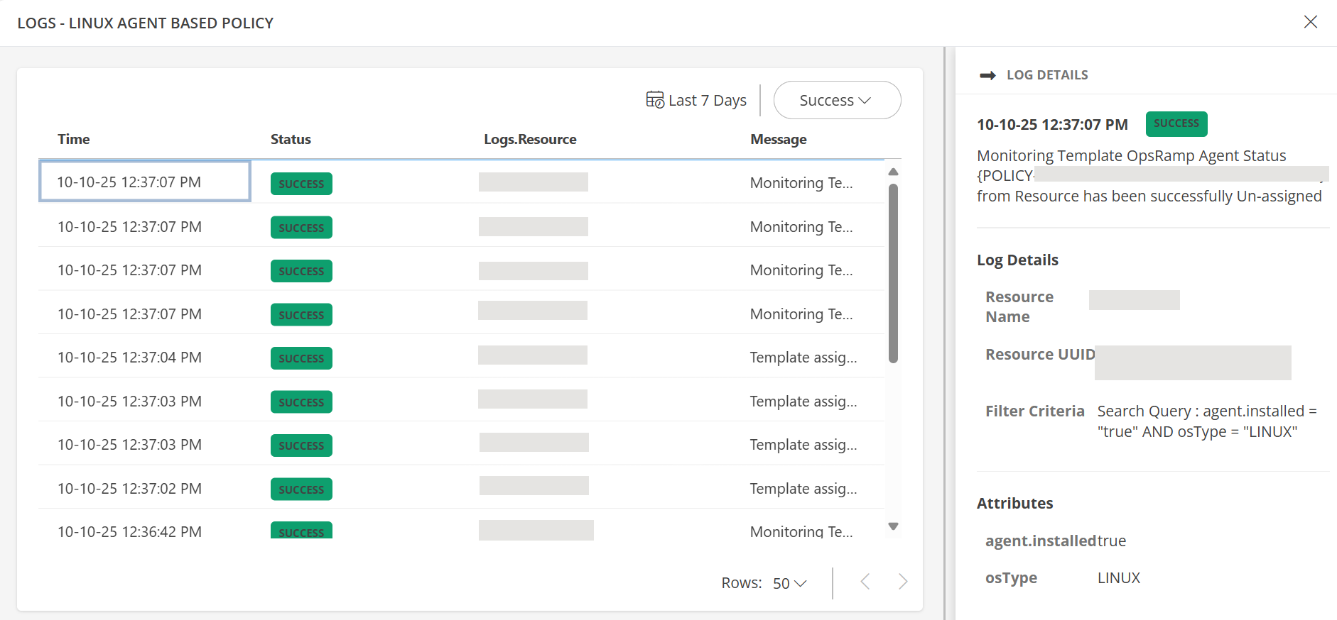 By default, all logs with Success status are displayed. - Click anywhere in a policy log row to view the Log details.