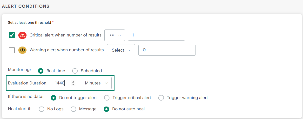 Earlier, the Evaluation Duration in OpsRamp’s Log Alert Definitions was limited to 30 minutes. This meant alerts could only be evaluated within short time windows, which caused repetitive triggers for long‑lived log events, Now, the Evaluation Duration in Log Alert Definitions has been extended from the maximum of 30 minutes to 1440 minutes (24 hours). This allows alerts to evaluate long‑lived log events such as password expiry notices, license expiration warnings, and certificate renewals without being restricted to short intervals.