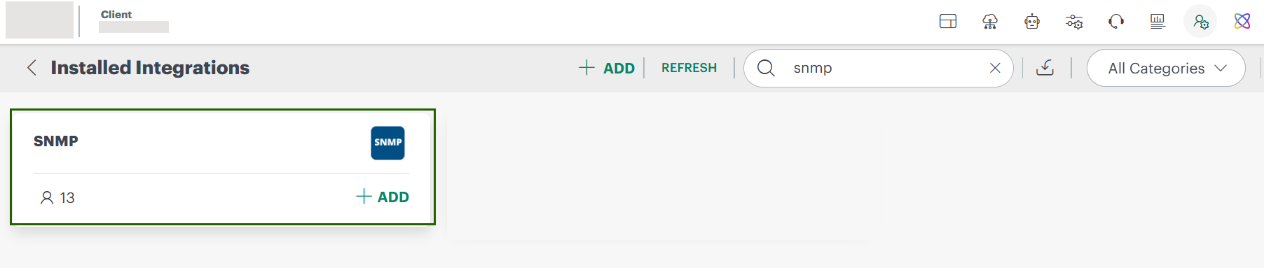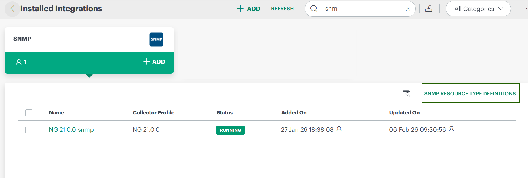 - After SNMP integration installation: On Installed Integrations, expand the SNMP Integration card to access the link.