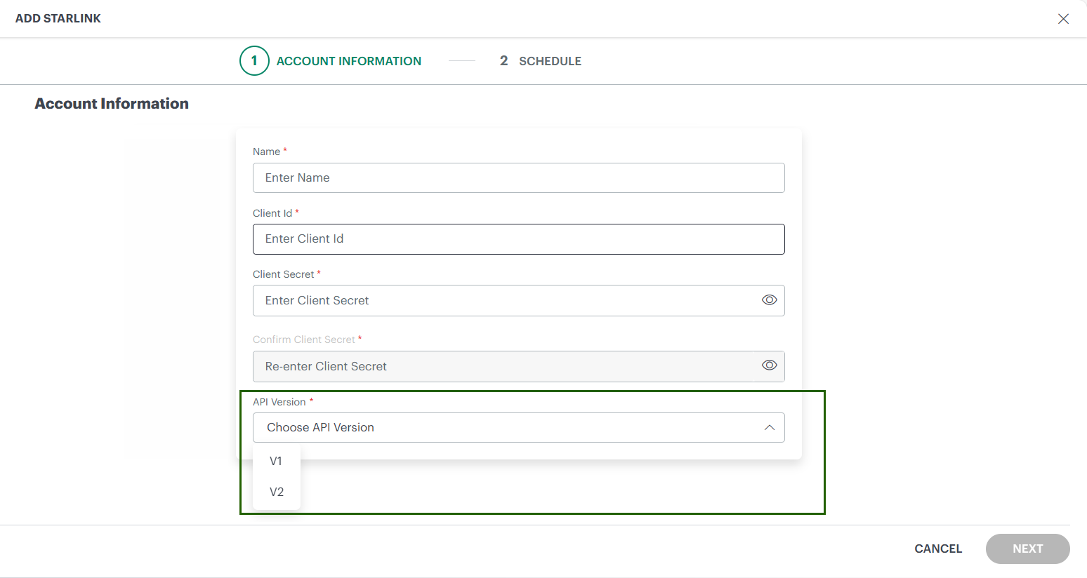 - During integration setup, use the new dropdown to select either the Starlink V1 or V2 API during the transition period.